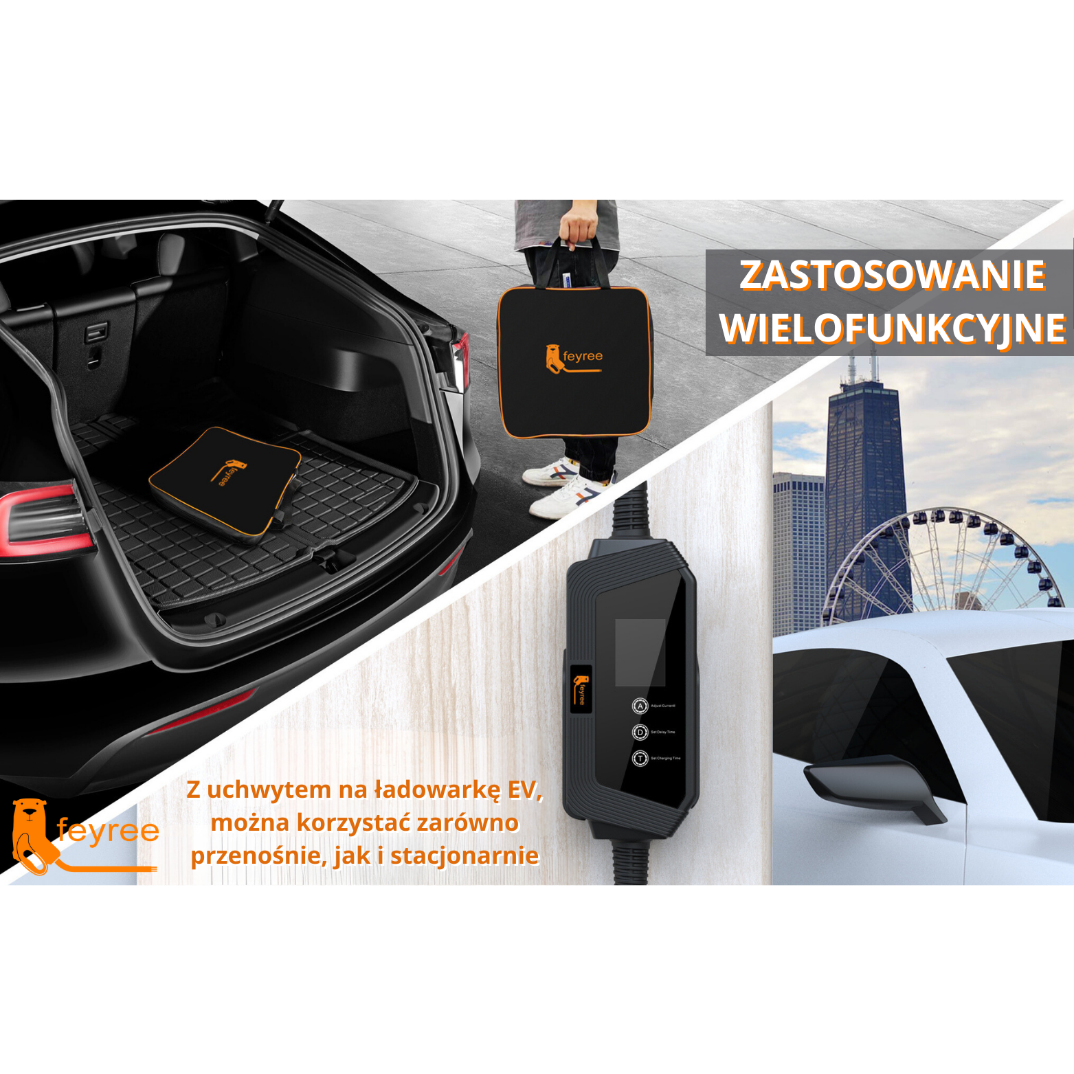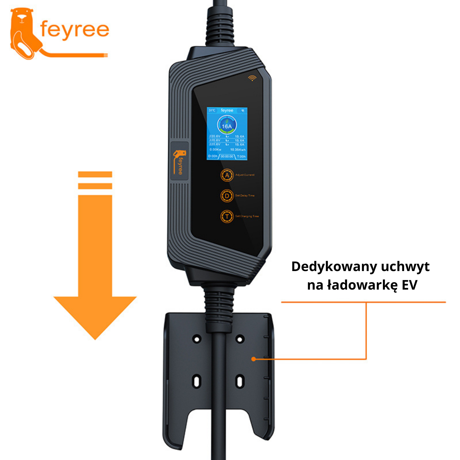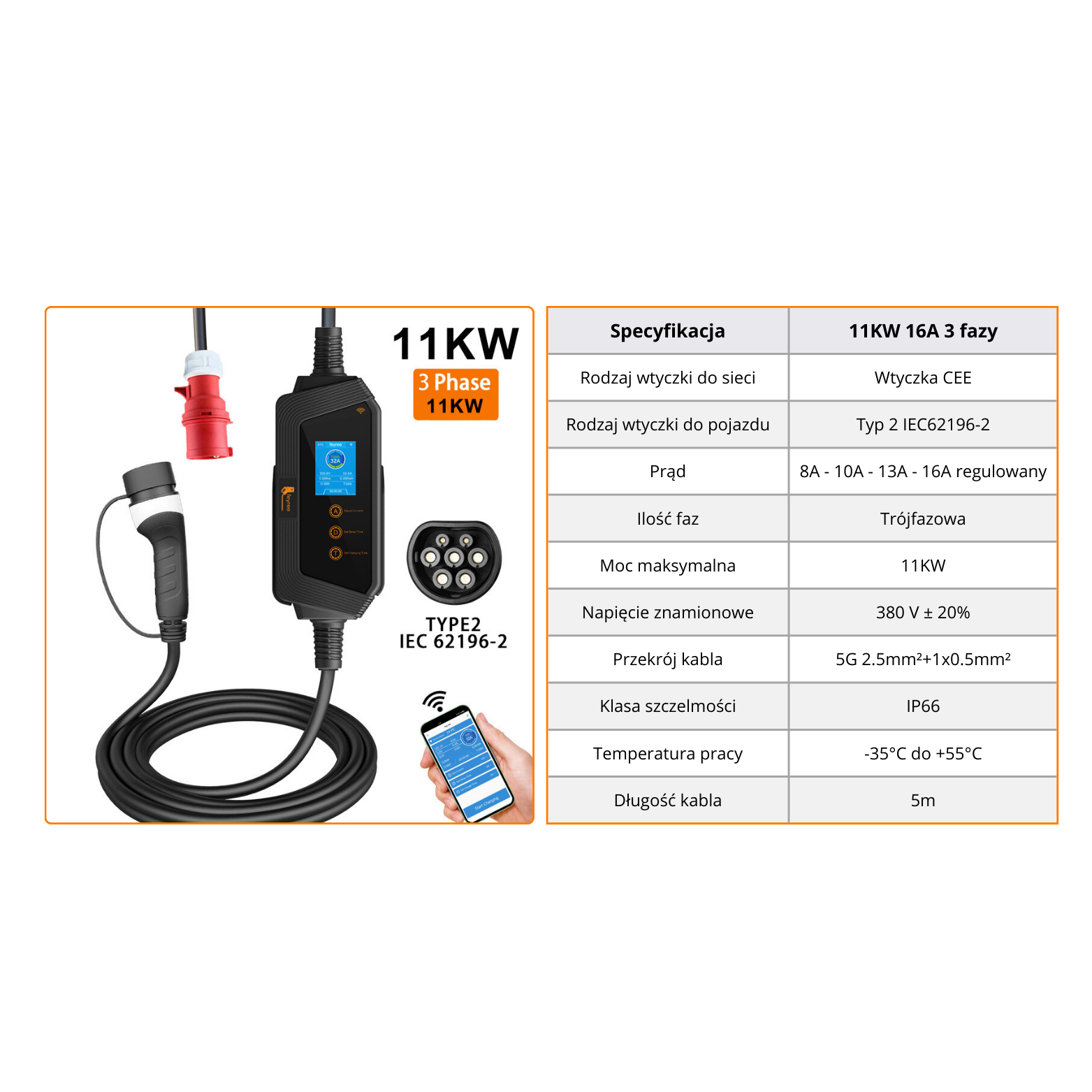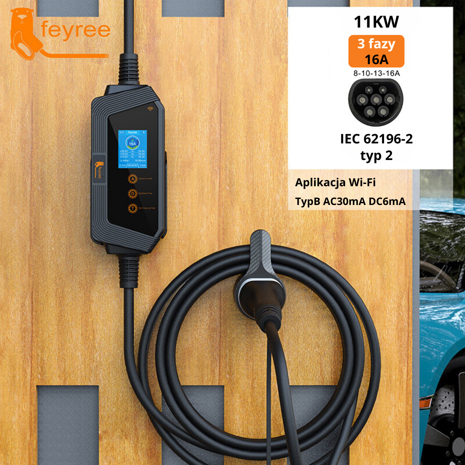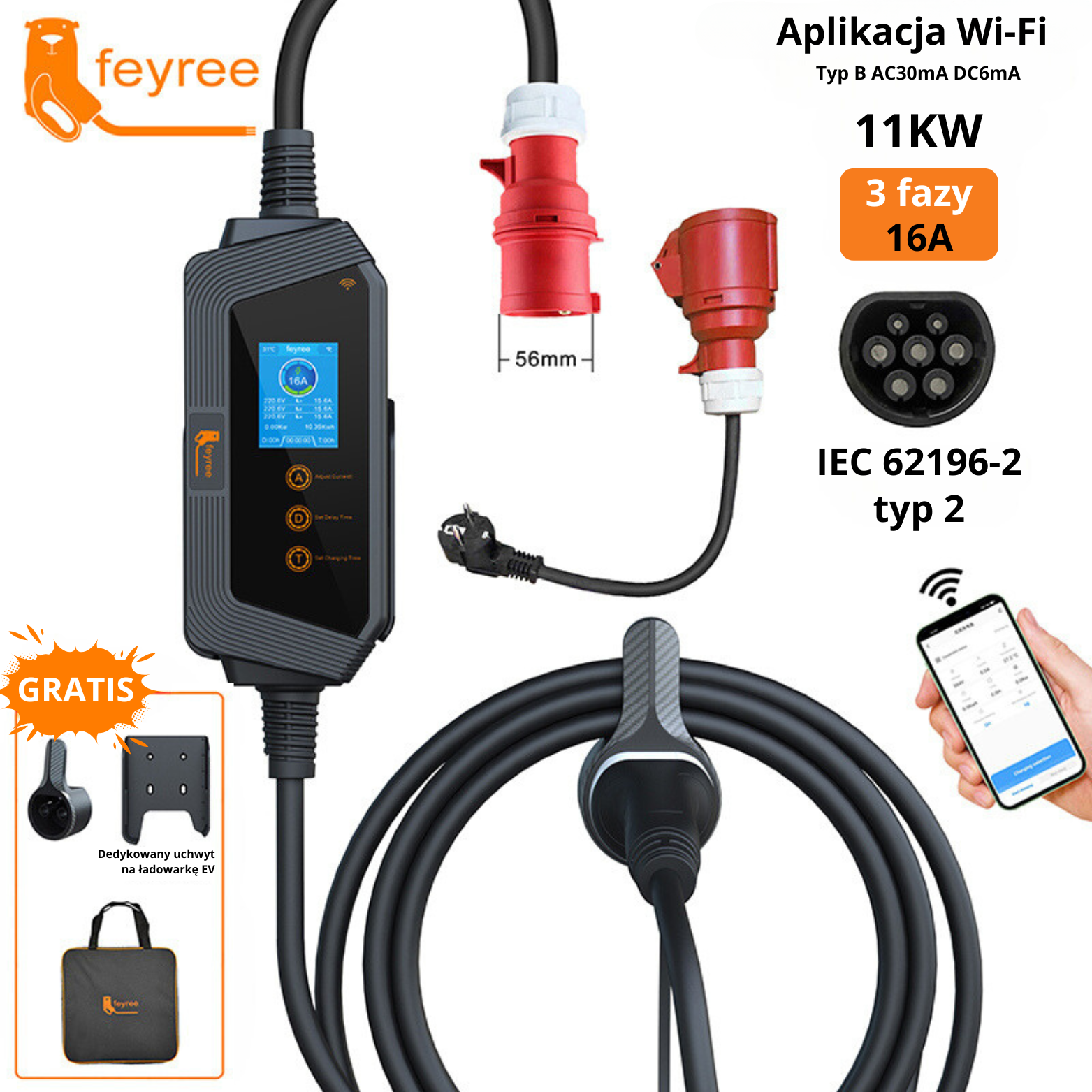 Feyree trójfazowa mobilna ładowarka EV typu 2 11KW 16A z aplikacją Wi-Fi + torba i uchwyt do mocowania kabla GRATIS
