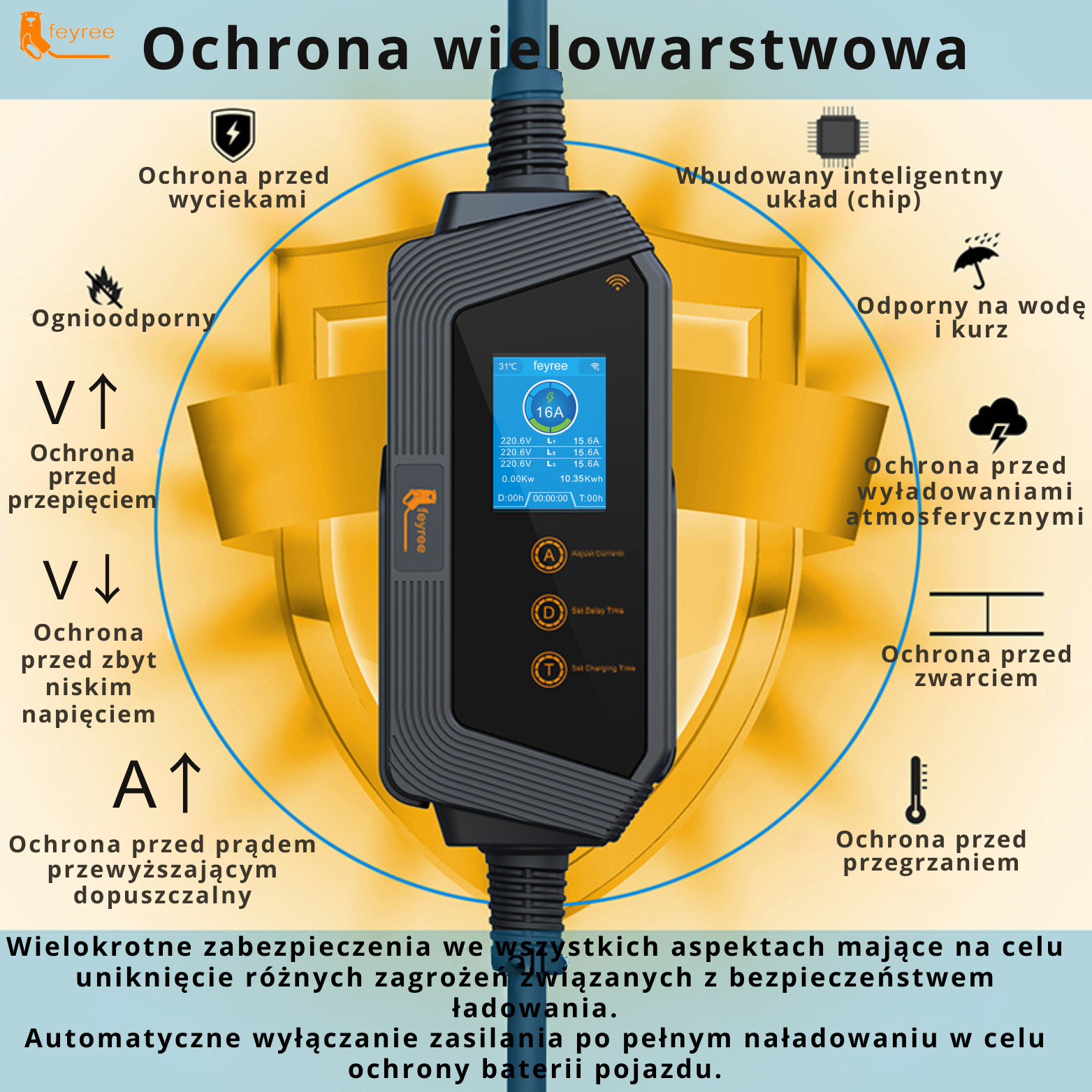 - inteligentna aplikacja Wi-Fi, monitorowanie ładowania w czasie rzeczywistym: wbudowana inteligentna aplikacja pozwala na ładowanie pojazdów poza godzinami szczytu poprzez ustawienie czasu ładowania, oszczędzając pieniądze na rachunkach za energię elektryczną. Po wybraniu zalecanego prądu samochodu z 8A, 10A, 13A lub 16A, urządzenie automatycznie ustawia ten sam poziom dla następnego ładowania.