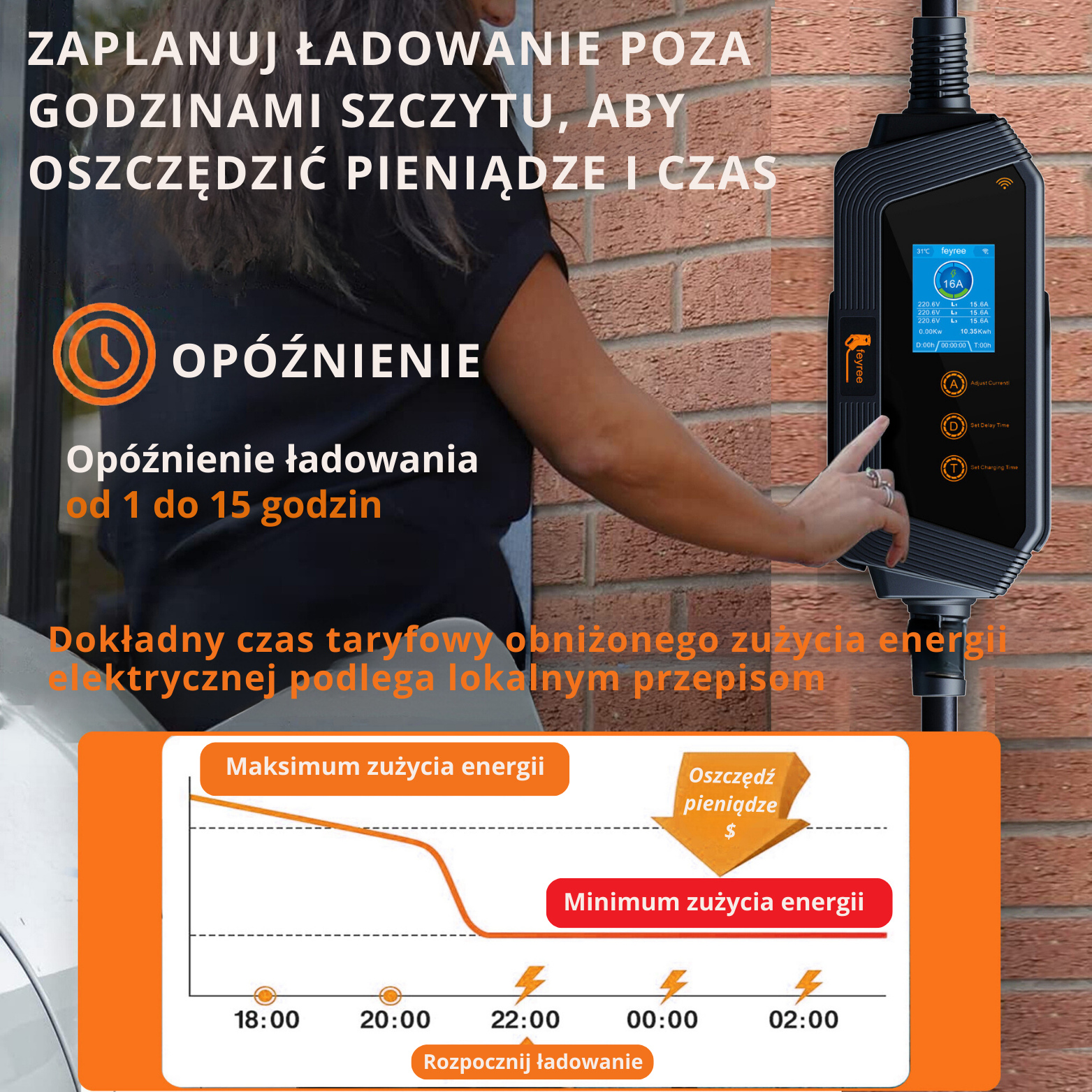 planowanie czasu ładowania: można rozpocząć ładowanie w wybranym czasie, naciskając przycisk opóźnienia. Idealne rozwiązanie do ładowania w nocy, a także do większej oszczędności, jeśli ładowanie odbywa się poza szczytem. Naciśnij przycisk "Opóźnienie", aby rozpocząć ładowanie. Po zakończeniu ładowania można pozostawić ładowarkę podłączoną do zasilania. Ładowarka automatycznie wyłączy się po pełnym naładowaniu.