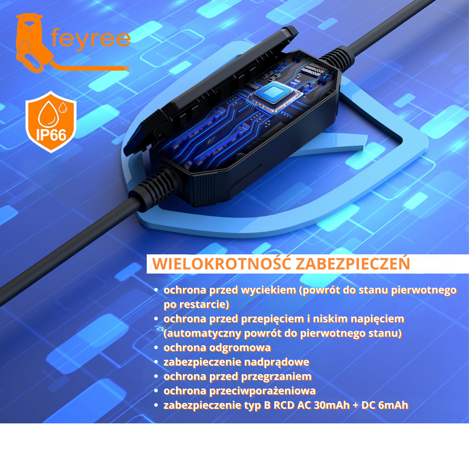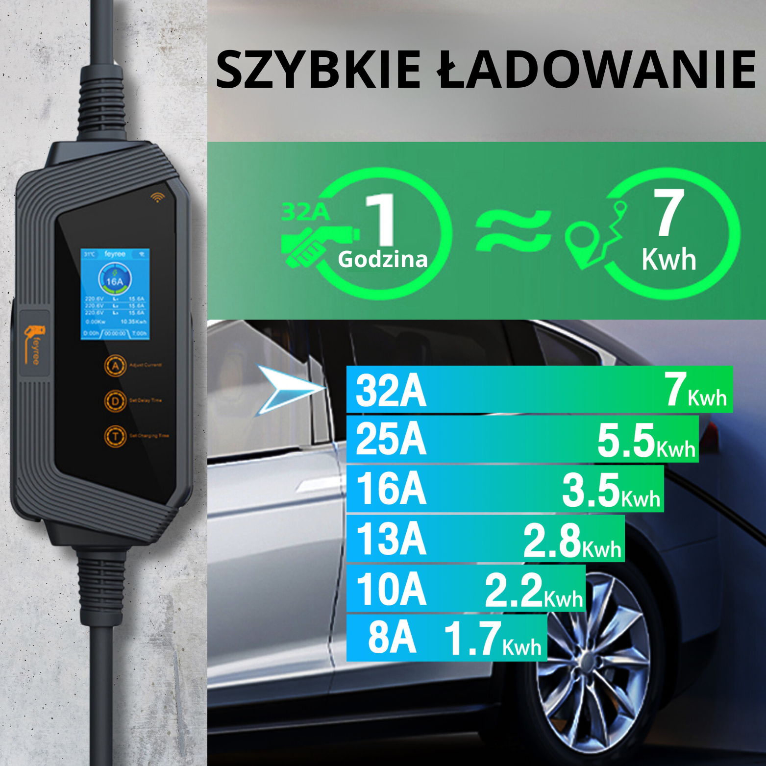 szybkie ładowanie: produkt zaprojektowany tak, aby ładowanie pojazdu było szybkie i bezproblemowe. Długi, 5cio metrowy przewód zapewnia wygodę użytkowania zarówno w garażu, jak i na podjeździe